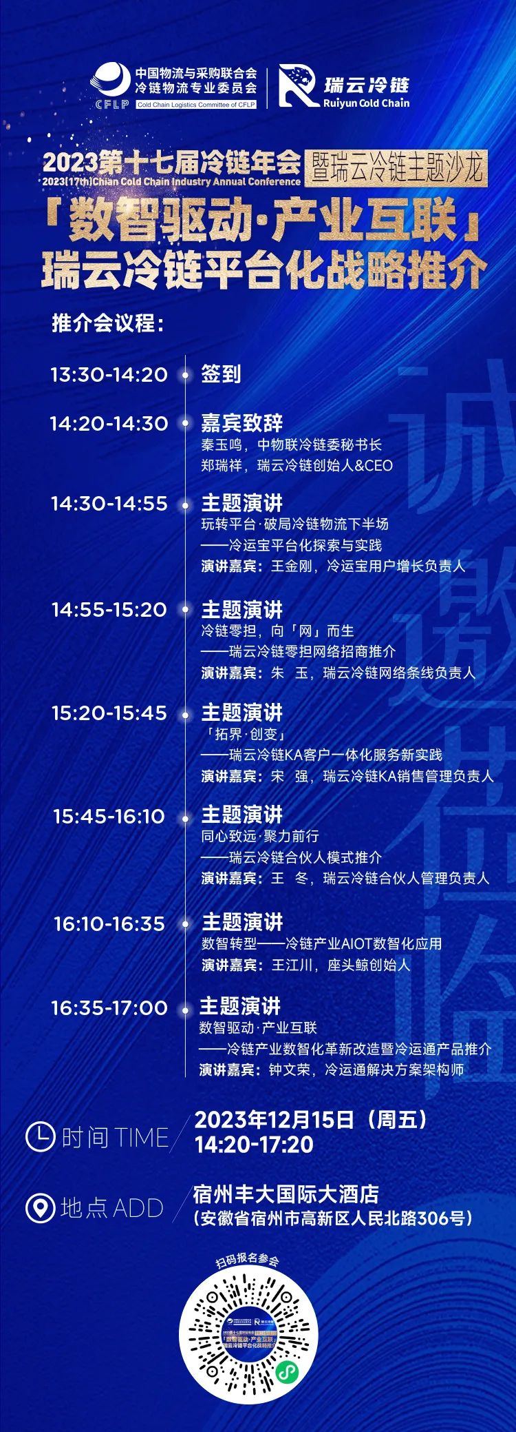 December 15-17, 2023, by the China Federation of Logistics and Purchasing hosted by the China Federation of Logistics and Purchasing Cold Chain Logistics Committee to host the "2023 17th China Cold Chain Industry Annual Conference" will be held in Suzhou, Anhui Province.