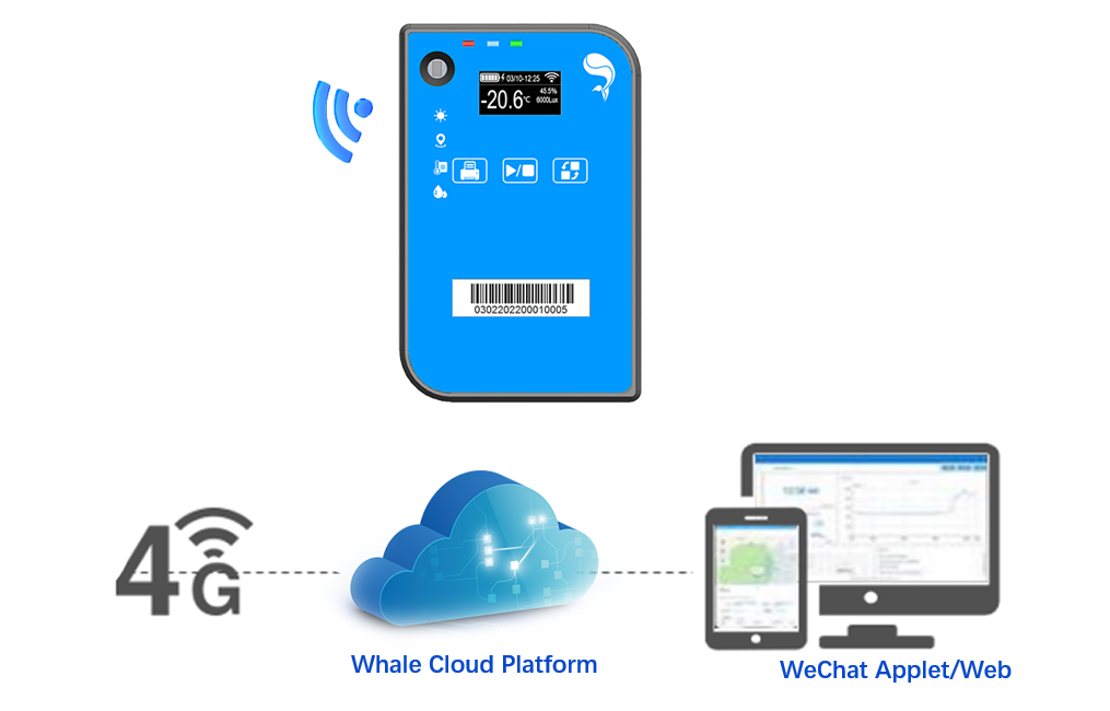 P3A cold chain version is an intelligent hardware product that collects data such as temperature, humidity and illumination in the environment and uploads them to the cloud platform through 4G communication technology. It can collect and monitor the required scenes 7x24 hours without interruption, and the data can be uploaded to the cloud platform and analyzed and processed in time after collection (please check the instructions for use of the whale cloud platform for specific operation). This product has the characteristics of small size, light weight, portable installation, accurate data, safe use, etc. It is widely used in cold chain fresh food/food/medicine and other fields for temperature and humidity monitoring of storage environment.