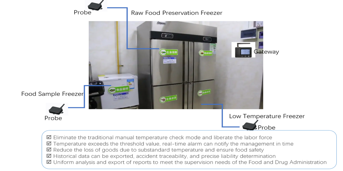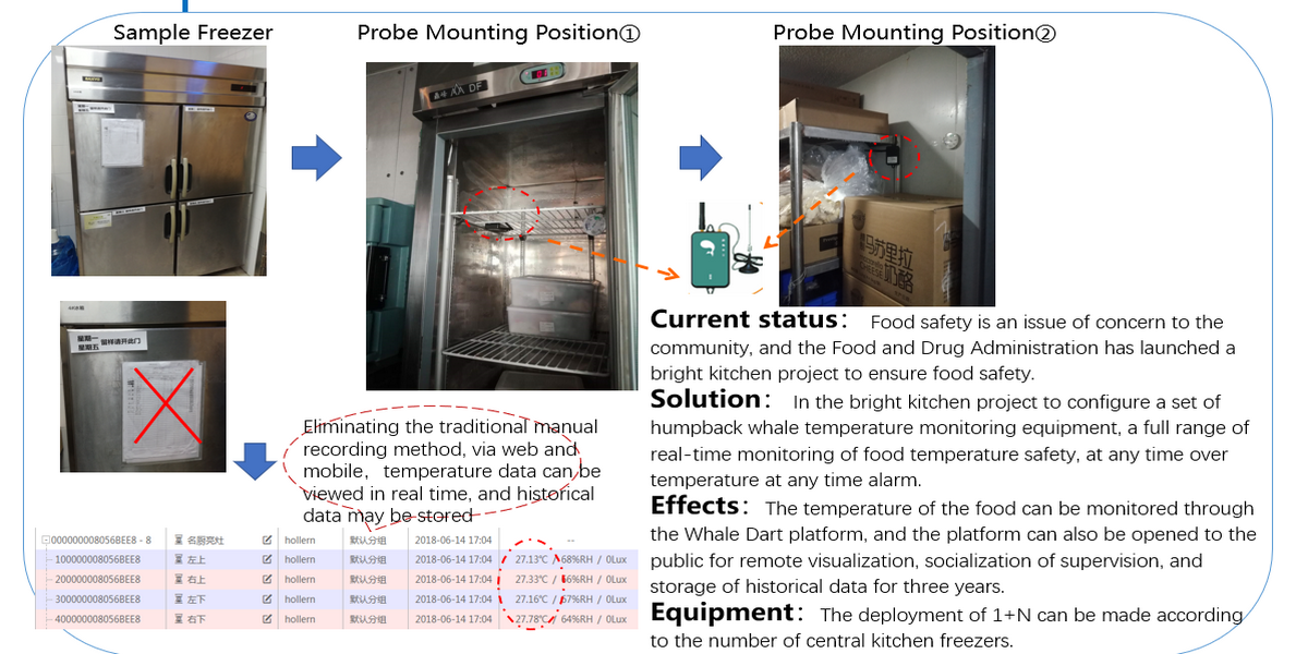 In recent years, food safety incidents have been frequent, posing a great threat to consumers' health. In 2018, the State Administration of Market Supervision issued a notice on the issuance of guidance on the work of bright kitchen and stove for catering services to promote the work of bright kitchen and stove, and schools, canteens and even catering kitchens are joining the "Internet + bright kitchen and stove" project. In order to better guard the people's food safety. In the restaurant industry around the enthusiastic carry out bright kitchen construction project, but in the process of carrying out bright kitchen construction, there is a display system of poor quality, display content is not standardized, regulatory data can not be shared, hardware equipment configuration is too low, daily operation and maintenance is not timely, and so on many problems. The bright kitchen project is a relatively complicated project, including live video, identification, AI video analysis and other functions, of which the cold chain temperature and humidity monitoring is a very important part. The Shanghai Food Safety Regulations clearly stipulate that failure to store, transport and display food and edible agricultural products with temperature and humidity control as required will result in rectification, fines and other measures for the enterprise. As a professional IoT multi-dimensional monitoring data manufacturer, Humpback Whale can monitor food temperature safety in all aspects of the bright kitchen project in real time through Whale Dart temperature monitoring equipment, and alarm at any time when the temperature exceeds the limit. The temperature of food is monitored through the Whale Dart platform, and the platform can also be opened to the public for remote visualization and socialization of supervision.