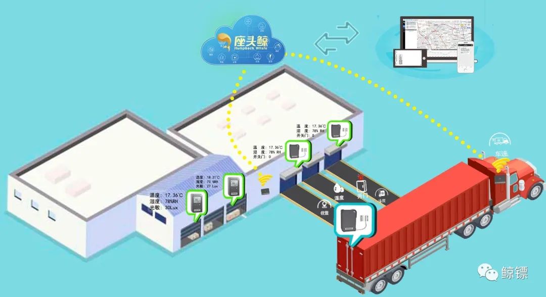 鲸镖系列智能"车载门磁"数据采集体系由鲸镖温湿度采集探头、智能门磁、云平台和手机公众号构成,构建出实时温度+湿度+开关门监控+一键报警系统。