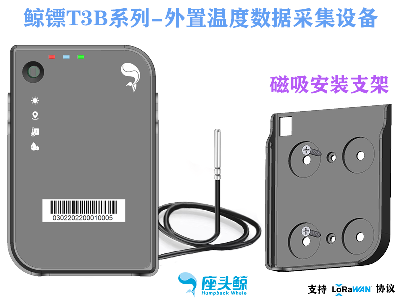 鲸镖T3B系列产品是一款采集环境中温湿度、光照度等数据并通过无线通信技术上传到云平台的智能硬件产品。 可对需要的场景进行 7x24 小时不间断采集跟监测,数据采集后能及时上传云平台并进行分析及相应处理(具体操作请查看鲸云平台使用说明)。 本产品具有体积小、重量轻、安装便携、数据精准、使用安全等特点,广泛应用于冷链生鲜/食品/医药等领域的储存环境的温湿度监测。