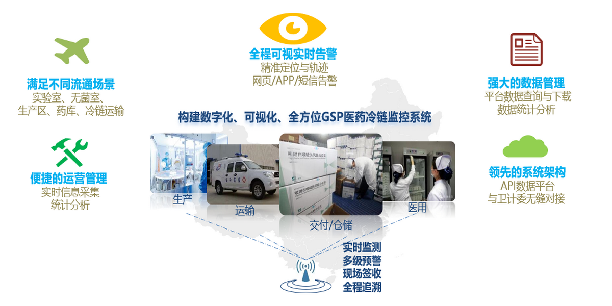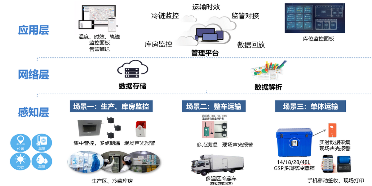 近年来,生物医药行业高速发展,为人们保持健康生活品质提供有力的支持,但随着药品品质对于运输贮藏条件的提高,在药品及药械冷链物流方面出现了较大的市场缺口,经营比较混杂。由于冷藏药品药械的使用覆盖全国各地,冷藏车在药品的冷链物流中起到了很大的作用,但是对于批量小、发货区域分散的发货则具有很大的局限性,对其的运输过程有效性的监控需得到有力保证。同时医药冷库以及医药门店的大量增加,对于冷藏贮藏药品药械的需求日益凸显。人们常能从媒体上看到温度敏感性药品、血液、疫苗因在生产运输过程中因缺乏有效的冷链物流管理而造成重大的人身事故、经济损失的新闻报道。对此我国政府相继出台了《药品经营质量管理规范》、《医疗器械冷链(运输、贮存)管理指南》、《疫苗储存和运输管理规范》等相关安全监管法律法规来规范冷链供应链的管理。要求消费前的各个环节中,始终处于规定的低温环境下,保证药品的冷链运输以及贮藏。座头鲸药品及药械流通冷链解决方案依据权威部门的各项管理规范,对冷藏车、冷藏箱、医药冷库、医药门店仓等均设计有效监控管理,服务客户保障冷藏药品药械的安全。