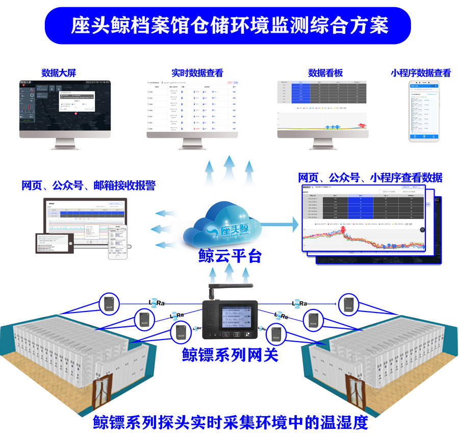 环境温湿度过高过低以及波动,都会对档案的寿命产生不良影响,座头鲸档案库房温湿度管理解决方案,通过可移动安装配置监控点的LoRa网关与探头的方案,实现对档案库房全方位的监控,实现数据的有效采集与长期记录,管理方可通过互联网以及手机端实时查看各监控点位的温湿度数据,在温湿度超过设定阈值的情况下通过各种方式进行实时报警,并可通过现场声光电报警、手机短信、微信报警信息等方式通知管理方及时干预。