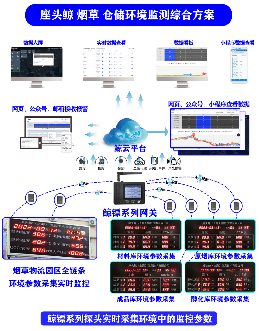 对于存储环境的要求相对于一般农产品而言比较高,往往烟叶的入库存储时间比较长,可能达到3年及以上,烟叶醇化库环境复杂,烟叶存储熏蒸过程中释放的气体具有腐蚀性。比普通冷链仓库的温湿度管理要复杂得多。烟叶仓库的温湿度控制中,并不仅是简单库内温湿度的有机关联关系,还受大气温湿度的变化而产生规律性变化,所以解决方案不仅需要解决库内温湿度的无线监控问题,也需要关注由于日期、月份、天气变化、库门的开放、白天与夜晚的温湿度变化,进而形成更为有效、科学的监控方案,帮助客户保障烟叶质量,降低损耗。