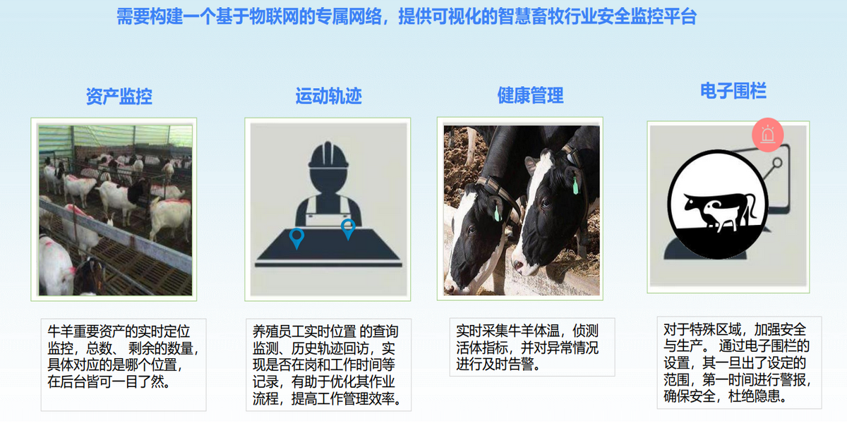 畜牧养殖是农村农业工作的一项重点内容,在现实的生产过程中大型畜牧养殖场面临着诸多的问题和困难,比如活体资产种类&数量多,实时位置不明确,清点困难;牛羊等活体资产是否在场内难以确定,且缺乏有效管理手段;混养,无法快速定位牛羊的位置跟区间的数量,以及每条牛羊的状态,包括是否离开围栏;活体资产抵押确权时,牛羊的确切位置跟运动状态,债权方无法远程快速确认;无法确定人员是否对牛羊正常管理进行干预等等。如此相应,以一种“更智慧”的方法来改进岗位人员工作的方式,以便提高管理的明确性、效率、灵活性和响应速度为核心的智慧牧场建设已经是大势所趋,智慧牧场将更多人工智慧、传感技术等高科技技术植入到牧场、养殖棚、牛羊穿戴设施、场地进出关口等各类物体中,并且被普遍互联,形成“物联网”,再与“互联网”整合在一起,实现智慧牧场域内的作业人员、牛羊的管理。座头鲸农牧场资产确权解决方案与智慧牧场建设有效结合,重点关注牛羊等位置管理,防患于未然,全面保障畜牧资产的安全。