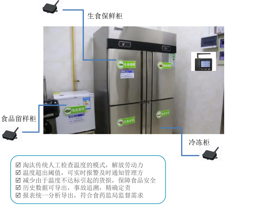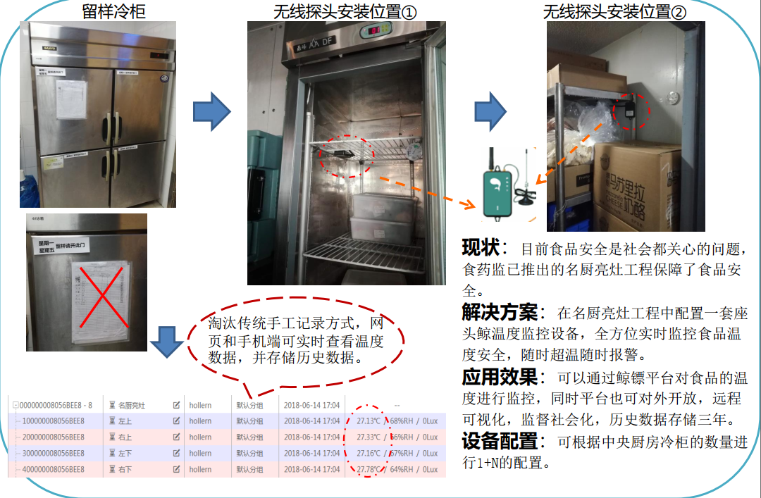 通常餐饮店或食堂后厨,一般不设置电子温度计,仅通过冷柜温度显示来监控温度,温度记录还是传统的手抄方式。如果遇到冷柜故障、柜门忘关灯情况,不能及时发现,减少货损。同时也容易出现监控缺失、设备“失灵”的状况, 有的餐厅后厨既不透明也无监控,有的安装了监控却“失灵”, 解释原因多为“坏了”或者“网络不好”,温度记录填写随意,没有追溯,不能真实反映食品安全状况。座头鲸名厨亮灶解决方案采用LoRa无线部署,可根据后厨冷柜数量进行1+N的配置,合理设定温度、湿度等阈值范围,实时监控报警,从根本上保障食品安全。